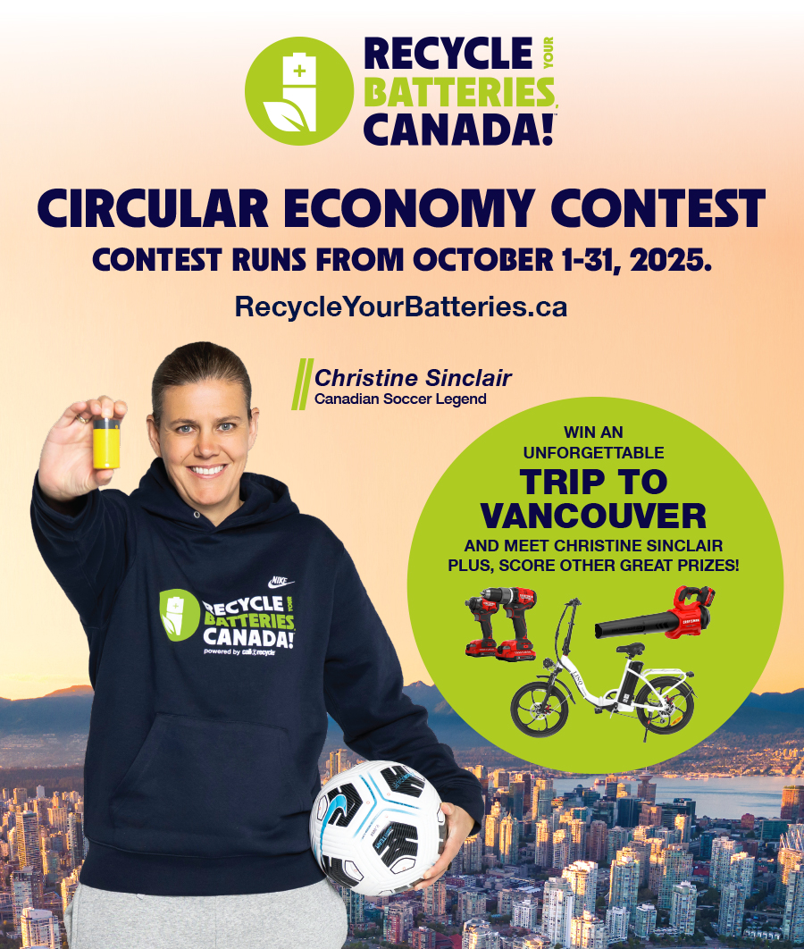 No purchase required. Contest begins at 9:00 a.m. Eastern Time (“ET”) on October 1, 2025, and ends at 11:59 p.m. ET on October 31, 2025. There are a total of eight (8) prizes available to be won as follows: one (1) Grand Prize trip for two to Vancouver consisting of air transportation, three (3) nights standard accommodation (double occupancy), $500 in spending money and a personal meet and greet with Christine Sinclair, with an approximate retail value of $2,650 based on a Toronto departure. Actual value will vary depending on point of departure and fare fluctuations; one (1) Linq 48V Folding E-Bicycle with retail value of $1,799.99; five (5) Craftsman V20 Brushless RP 2-Tool Combo kits, each with a retail value of $259.99; and one (1) Craftsman V20* BRUSHLESS RP™ Blower (5.0Ah) with a retail value of $219.99. Each selected entrant must be confirmed a winner including by correctly answering a skill-testing question. Open to legal residents of Canada who are age of majority in the province or territory of residence at time of entry. Odds of winning depend on number of entries received before contest closes. Limit of one (1) entry per person regardless of method of entry. Official Rules and entry details available at: RecycleYourBatteries.ca/contest
